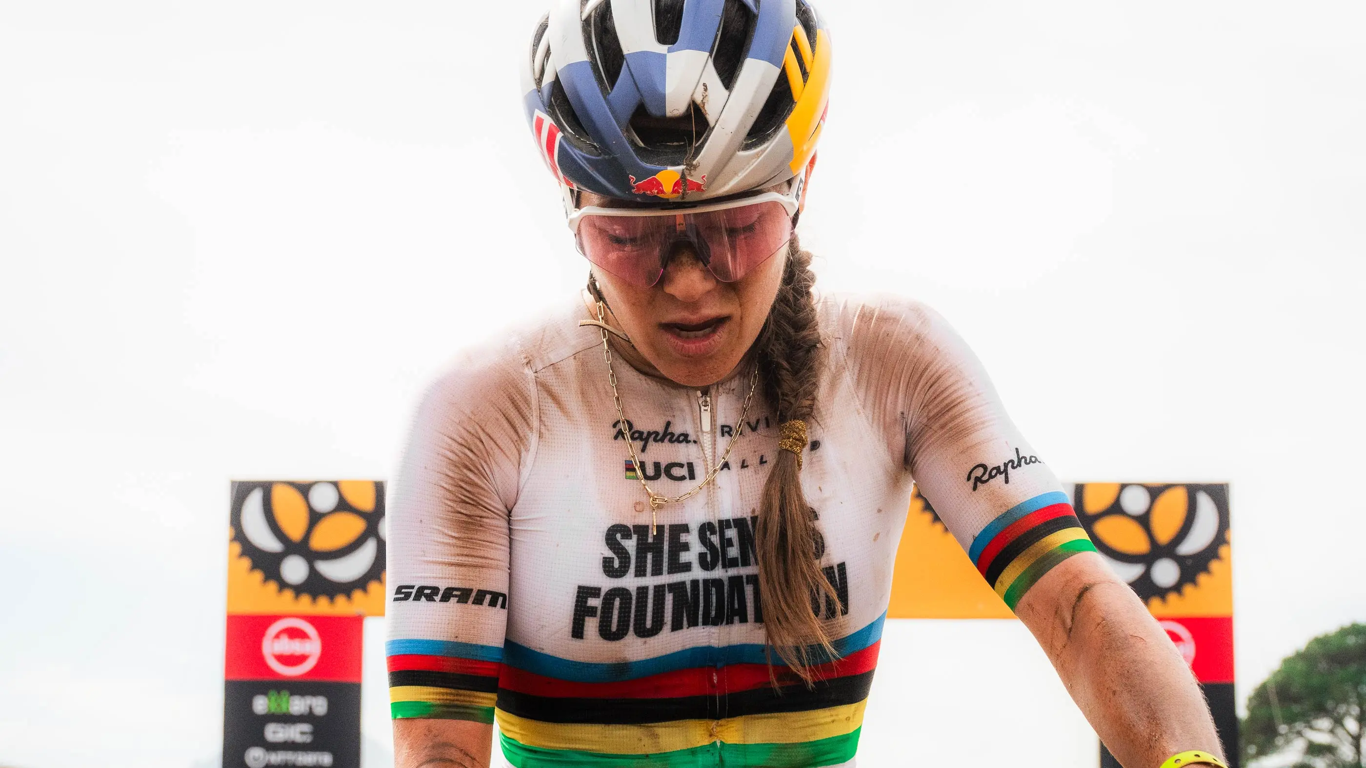 In the women’s race, world marathon champion Kate Courtney of the US and her Italian teammate Greta Seiwald (She Sends Foundation) fought hard to try and open a gap over GC leaders Candice Lill and Alessandra Keller (Thömus Maxon Sabi Sabi). But the South African Dutch team managed to bring back all their accelerations before eventually pulling clear to win their fourth stage in a row. As they have all week, the plucky She Sends outfit finished second and now trails by 4:53 in the overall.