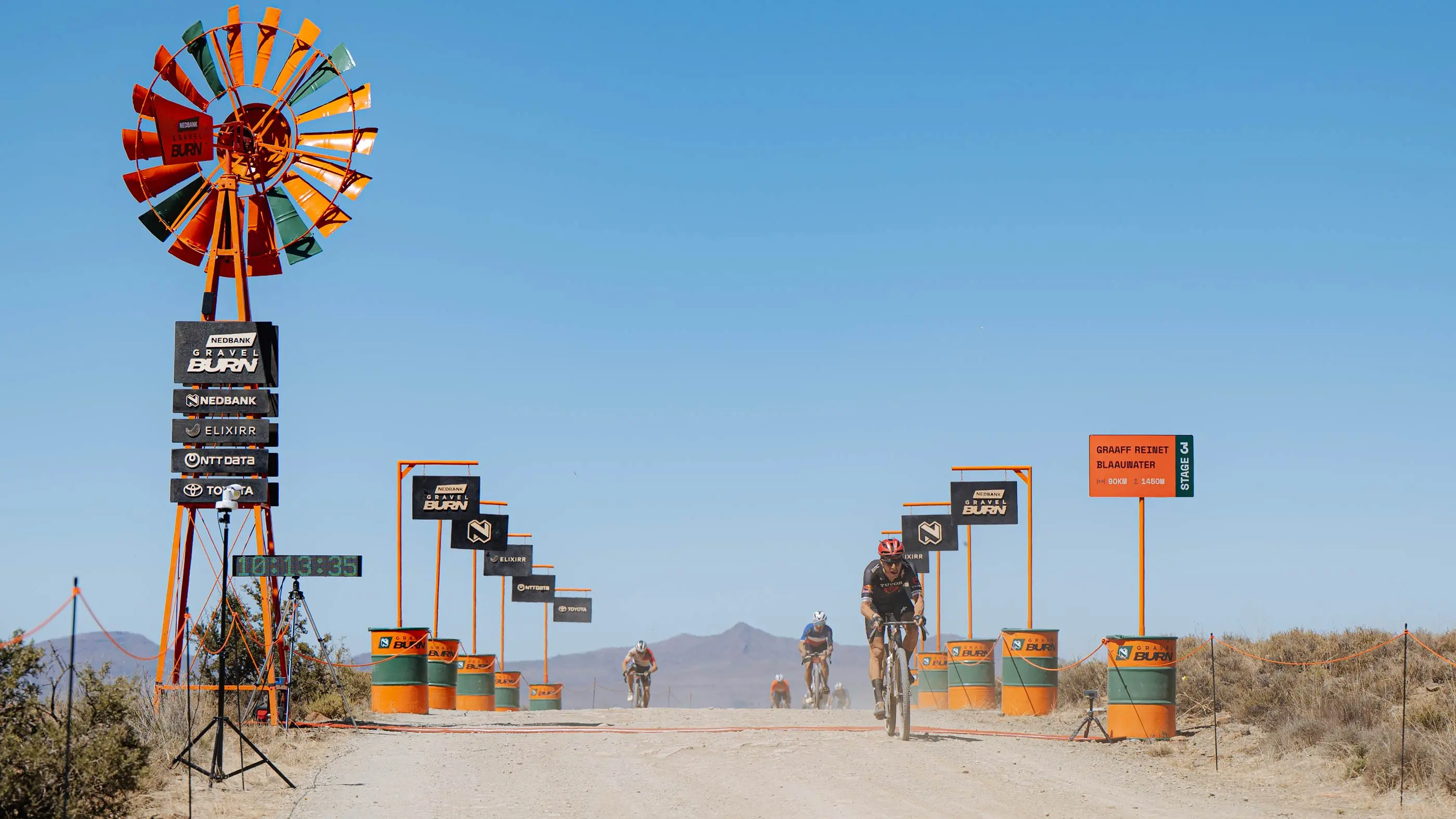 Classic Karoo blue skies and cool, calm conditions greeted Nedbank Gravel Burn participants on the morning of Stage 3. The Union High School marimba band set the scene for the day, showcasing their musical skills, watched by some of the world’s best cyclists. The plink and plonk of the marimba keys quickly gave way to the start signal – the blowing of the Kudu horn, with riders heading out of Graaff Reinet on a short neutral tar section before hitting the Karoo gravel for the day.